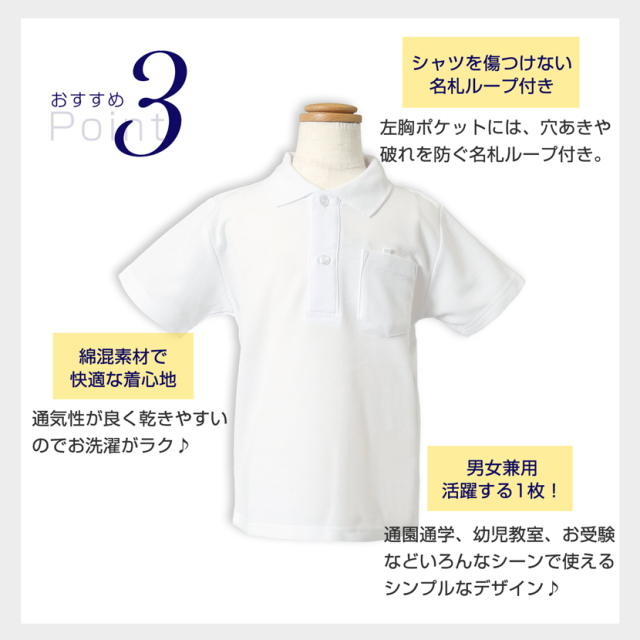 | 商品の特徴 | お子様用 角襟 半袖ポロシャツ 白シャツ 鹿の子素材 101 お受験や行動観察使用後も制服や通学服としてでも使えるシンプルで男女兼用のポロシャツ。綿混素材でさらりと快適な着心地で元気いっぱい動くお子様に最適です。 近年は1年の間で暑い日が長く続くようになり半袖ポロシャツは何枚待っても助かる1枚です。 お受験~通園通学用に適したシャツを傷つけない様に工夫された名札ループ付きですので、スクールシャツとして最適な作りとなっております。 また、汗をかいてもすぐに発散させてくれる素材なので、汗っかきなお子様や活発なお子様には最適です。きちんとした印象を与える襟元ですが、お子様がひとりでも脱ぎ着しやすいようにストレッチ素材を使用し、これまで襟のある服やひとりでの着替えに慣れていなかったお子様にも安心して着ていただくことができます。 日々、成長する御子様の頻繁な需要に負担の少ないリーズナブルな価格が人気です。 制服や通学服とも合わせやすく、お受験以外でもさまざまなシーンで活躍してくれること間違いなしの1着です |