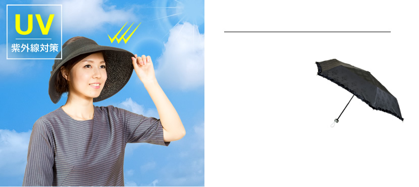 晴雨兼用UVカットできるフォーマル折りたたみ日傘や、通勤・お散歩、お子様の送迎などでお使い頂けるお上品なサンバイザーをご準備いたしました。毎日の紫外線対策もエスコミュールのこだわりUVカット小物でエレガントに。