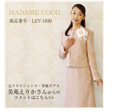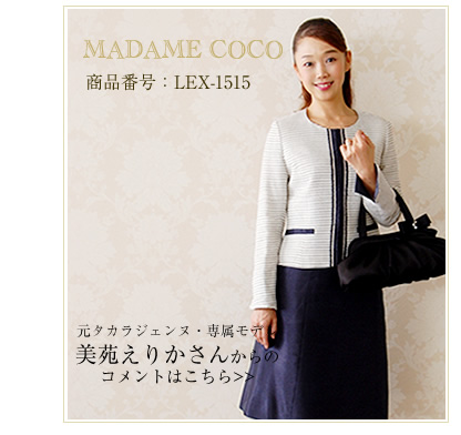 ジャケットの丸みを帯びた襟、ころんとしたくるみボタンが可愛らしく、やさしい印象のスーツだと思いました。清楚で落ち着いた雰囲気で、様々なシーンで活用できるデザインだと思います。また、ワンピースは首もとの開きのデザインが美しく、ネックレスが映えそうです。