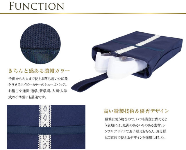 子供から大人まで使える落ち着いた印象を与えるネイビーカラーのシューズバッグ。お稽古や通園・通学、新学期、入園・入学式のご準備にも最適です。
