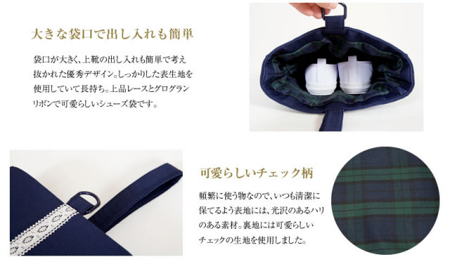 袋口が大きく開くので、上履きなどの出し入れも簡単です。表地・裏地ともにしっかりした光沢ある生地を使用しているので長持ちします。お色も上品な濃紺カラーを採用。