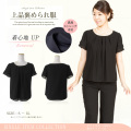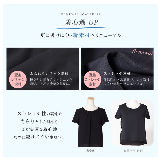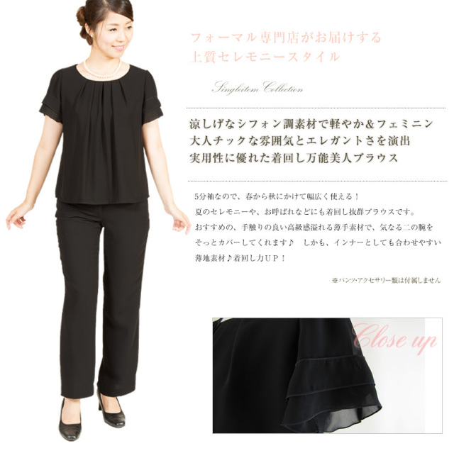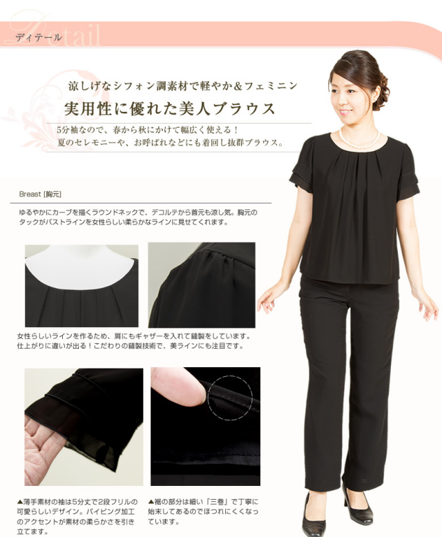 シンプルな丸襟はアクセサリーが映えるので華やかな着こなしも楽しめます。胸元のタックがバストラインを女性らしい柔らかなラインに 見せてくれます。シフォン素材の透明感のある半袖は2段のフリル調の可愛らしいデザイン。パイピング加工のアクセントが素材の柔らかさを引き立てます。ブラウスで裏地があるのはフォーマルならでは。肌触りの良いサテン地の総裏地なので透けるのを気にせずに着用できます。ボタンの無いかぶりスタイルで、全体にふんわりとしたラインです。