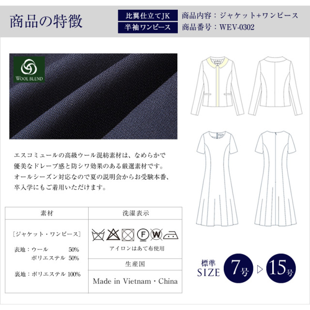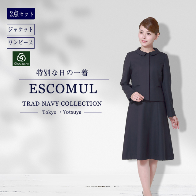 エスコミュールの高級ウール混紡素材は、なめらかで優美なドレープ感と防シワ効果のある厳選素材です。