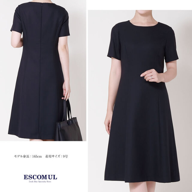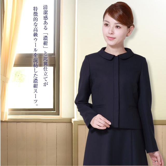 エスコミュールの濃紺スーツは長時間座ってもシワがよりにくく、レーヨンを混紡